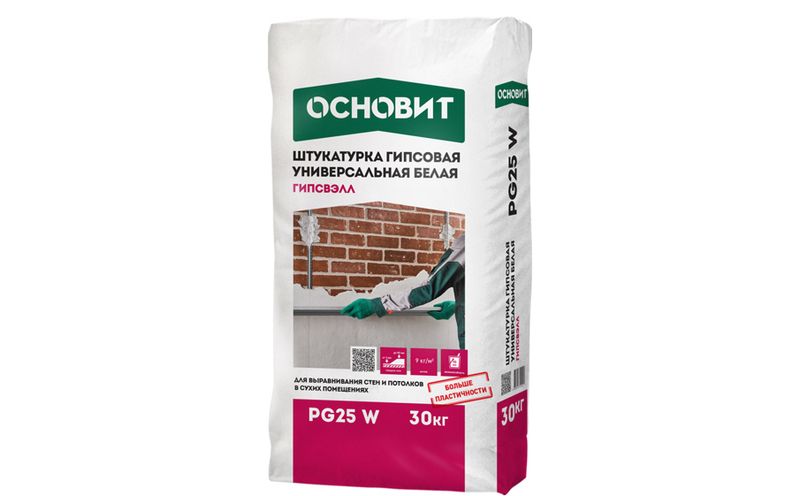 Гипсовая штукатурка белая ОСНОВИТ ГИПСВЭЛЛ PG25 W предназначена для выравнивания стен и потолков в помещениях с нормальной влажностью.